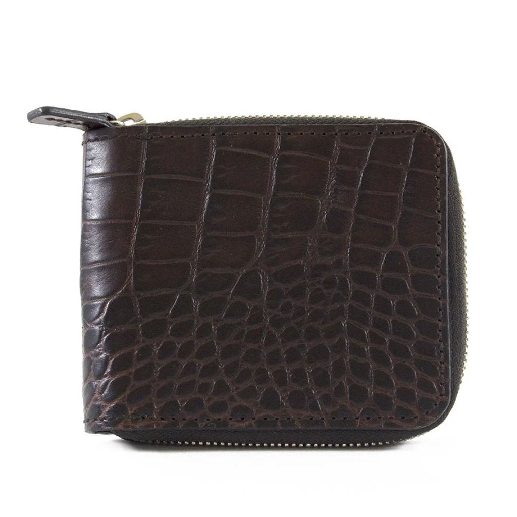 Introducing our opulent alligator-embossed zip-around leather wallet, meticulously handcrafted in the USA. This 4 3/8" x 3 3/8" wallet combines style and practicality seamlessly, fitting perfectly in your pocket or purse.