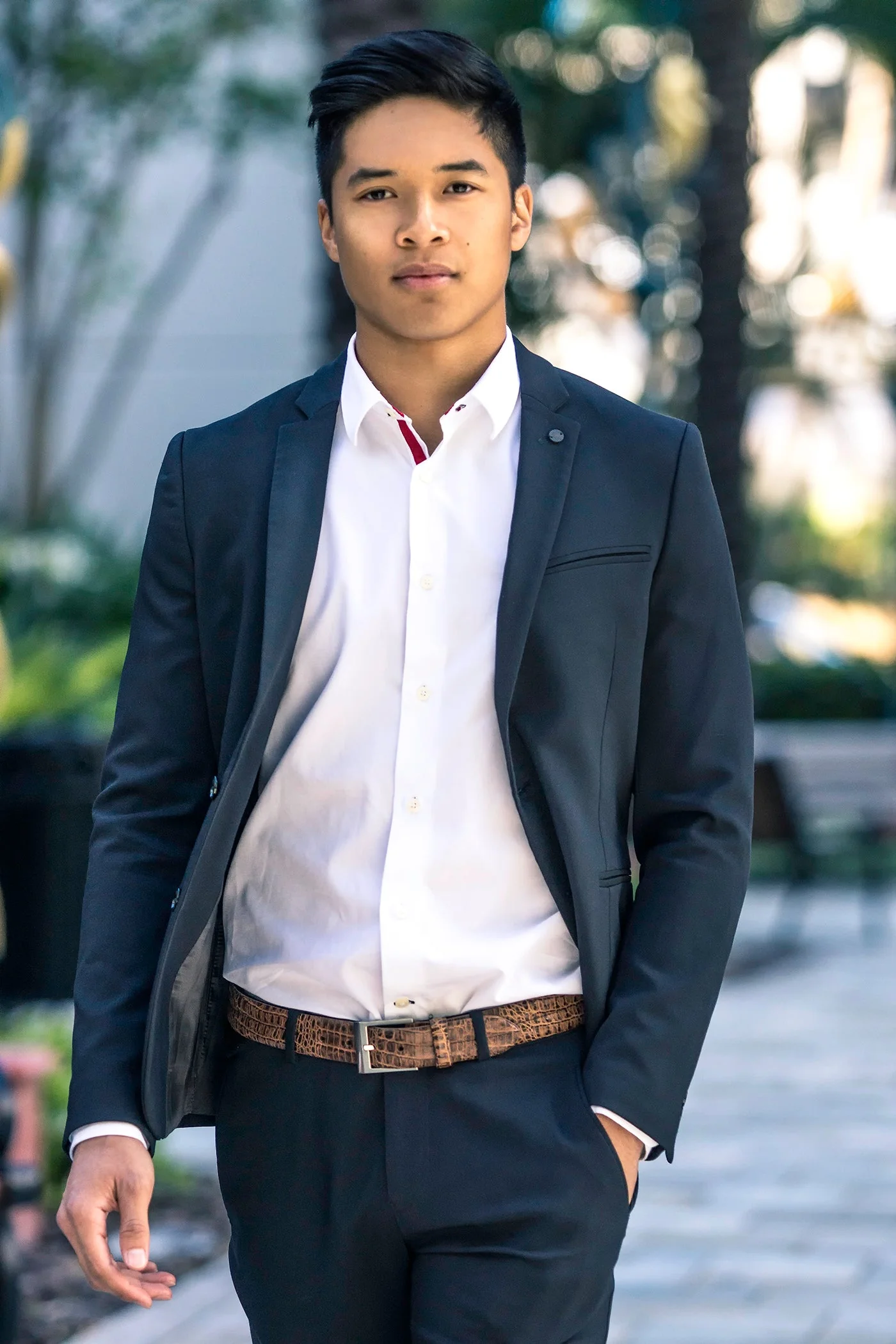 With a subtle stitch down the middle of the belt that creates a double-hump detail throughout your belt, this is a cool twist on our smooth leather double barrel belt with an embossed crocodile. Full-grain leather lining. Ā